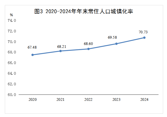 城乡融合和区域协调发展扎实推进。年末常住人口城镇化率为70.73%,比上年末提高1.15个百分点。分区域[11]看,全年东部地区生产总值7782.6亿元,比上年增长4.1%;中部地区生产总值16259.4亿元,增长6.7%;西部地区生产总值2251.5亿元,增长5.3%。