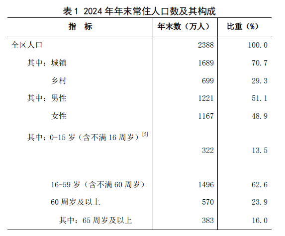 [5]2024年年末,全区0-14岁(含不满15周岁)人口为298万人,15-64岁(含不满65周岁)人口为1707万人。
