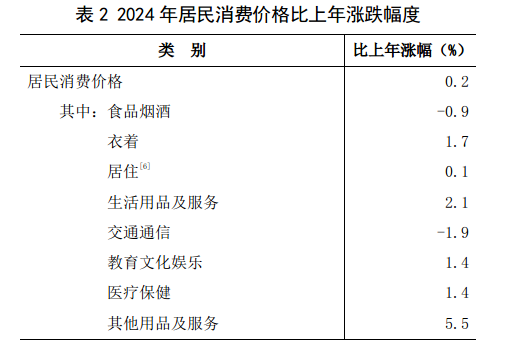 全年居民消费价格比上年上涨0.2%。全年工业生产者出厂价格比上年下降3.4%,工业生产者购进价格比上年下降2.9%。