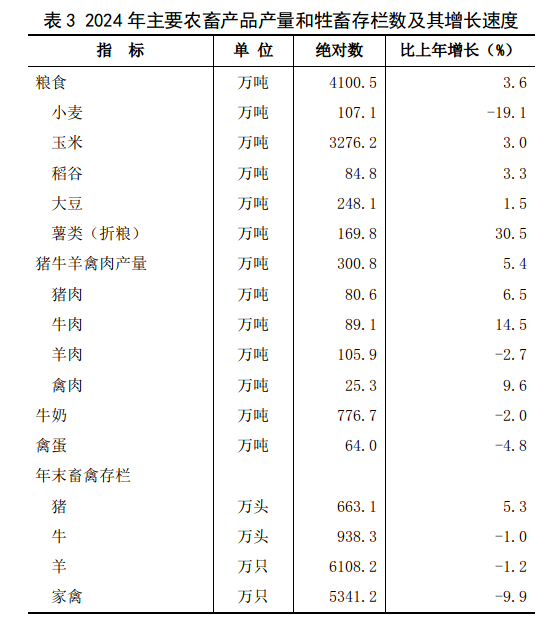 全年猪牛羊禽肉产量300.8万吨,比上年增长5.4%。其中,猪肉产量80.6万吨,比上年增长6.5%;牛肉产量89.1万吨,增长14.5%;羊肉产量105.9万吨,下降2.7%;禽肉产量25.3万吨,增长9.6%。禽蛋产量64.0万吨,下降4.8%。牛奶产量776.7万吨,下降2.0%。年末生猪存栏663.1万头,比上年末增长5.3%;牛存栏938.3万头,下降1.0%;羊存栏6108.2万只,下降1.2%;家禽存栏5341.2万只,下降9.9%。