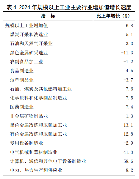 全年规模以上工业中,煤炭开采和洗选业比上年增长5.1%,食品制造业增长4.5%,石油、煤炭及其他燃料加工业增长7.6%,化学原料和化学制品制造业增长7.5%,非金属矿物制品业增长1.3%,有色金属冶炼和压延加工业增长12.8%,专用设备制造业下降2.9%,电气机械和器材制造业增长41.3%,计算机、通信和其他电子设备制造业增长58.6%,电力、热力生产和供应业增长8.2%。