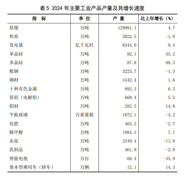 全年原煤产量[12]129991.1万吨,比上年增长4.7%;发电量8344.0亿千瓦时,增长9.4%。规模以上工业企业产品中,焦炭产量5022.5万吨,下降1.0%;单晶硅产量92.1万吨,增长55.2%;钢材产量3442.4万吨,增长1.6%;原铝产量668.4万吨,增长5.5%;乳制品产量461.9万吨,下降2.8%。