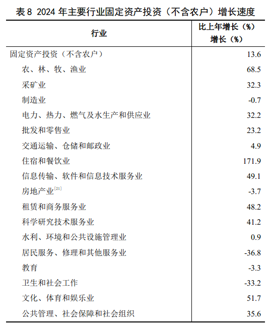 [14]规模以上服务业统计范围包括:年营业收入2000万元及以上的交通运输、仓储和邮政业,信息传输、软件和信息技术服务业,水利、环境和公共设施管理业,卫生行业法人单位;年营业收入1000万元及以上的房地产业(不含房地产开发经营),租赁和商务服务业,科学研究和技术服务业,教育行业法人单位;以及年营业收入500万元及以上的居民服务、修理和其他服务业,文化、体育和娱乐业,社会工作行业法人单位。2024年规模以上服务业企业财务指标增速按可比口径计算。