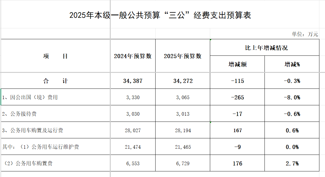 根据《ld体育中国官方网站办公厅关于改革完善内蒙古自治区本级财政科研经费管理的实施意见》(内政办发【2022】37号),科研经费中列支的国际合作和交流费用不纳入“三公”经费统计范围。剔除科研经费中“因公出国(境)费”后,2025年,自治区本级一般公共预算安排本级行政单位、事业单位(含参照公务员法管理的事业单位)和其他单位“三公”经费预算数3.43亿元,下降0.3%。其中,因公出国(境)费3065万元,下降8%;公务接待费3013万元,下降0.6%;公务用车购置及运行维护费2.82亿元,同口径对比增长0.6%,其中,公务用车购置费6729万元,增长2.7%,主要用于本级机关事业单位公务用车正常配置更新,公务用车运行维护费2.15亿元,与上年持平。