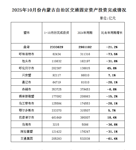 2025年1-10月份全区公路水路交通固定资产投资完成情况