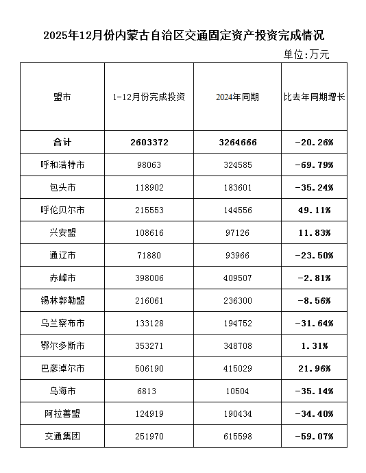 2025年1-12月份全区公路水路交通固定资产投资完成情况