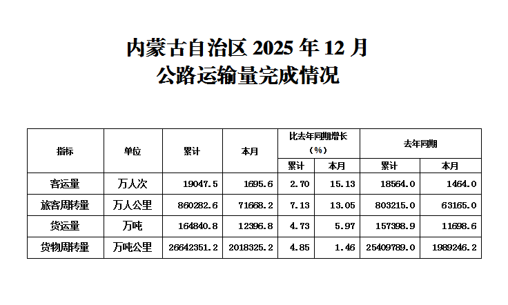 内蒙古自治区2025年1-12月公路运输量完成情况