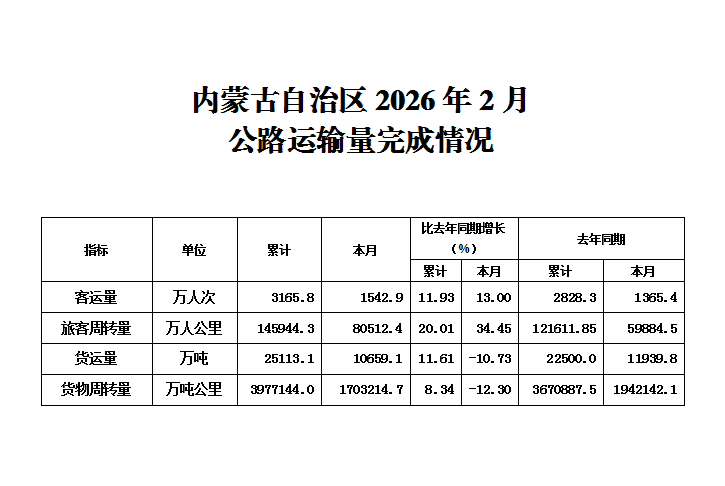 内蒙古自治区2026年1-2月公路运输量完成情况