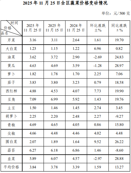 11月25日,全区蔬菜综合平均零售价格为3.84元/500克,环比上涨1.59%。本旬监测的15种蔬菜品种价格12涨3降,上涨幅度居前的品种为圆白菜、西红柿、大白菜、,分别上涨9.52%、7.73%、6.96%。与去年同期相比,15个蔬菜品种综合平均零售价格上涨13.27%。