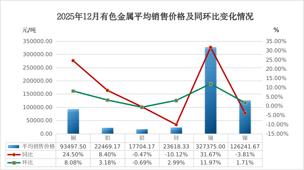 锌(0# 锌锭)、锡(1# 锡锭)、镍(1#)12月平均销售价格分别为每吨23618.33元、327375.00元、126241.67元。环比,锌、锡、镍价格分别上涨2.99%、11.97%、1.71%;同比,锡价格上涨31.67%,锌、镍价格分别下降10.12%、3.81%。