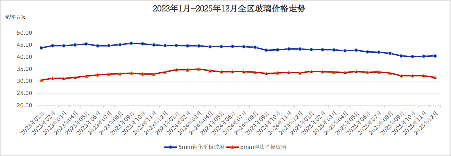 5mm浮法平板玻璃、5mm钢化平板玻璃12月份平均价格分别为每平方米31.50元、40.42元。环比,5mm浮法平板玻璃下降2.19%,5mm钢化平板玻璃价格略涨0.42%;同比分别下降5.76%、6.55%。