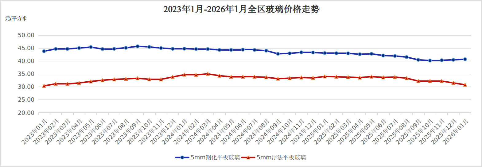 5mm浮法平板玻璃、5mm钢化平板玻璃1月份平均价格分别为每平方米30.79元、40.64元。环比,5mm浮法平板玻璃价格下降2.26%,5mm钢化平板玻璃价格略涨0.54%;同比价格分别下降9.44%、5.56%。