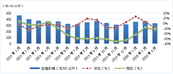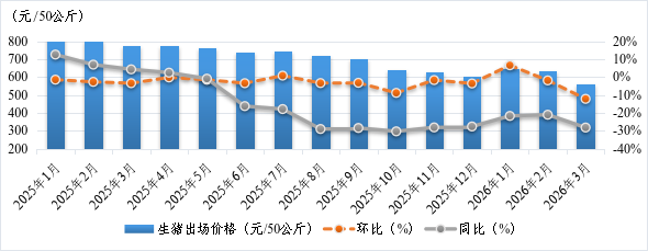 3月份,生猪出栏量持续处于高位,市场供应存在压力;而居民鲜肉采购需求正值节后传统淡季,下游消费对生猪市场的支撑作用有限,我区生猪出场价格下降。3月份全区生猪平均出场价格为560.41元/50公斤。与2月份相比(下称环比),下降12.12%;与2025年3月份相比(下称同比),下降28.20%。从周监测情况看,3月4日、11日、18日、25日全区每50公斤生猪平均出场价格分别为593.17元、560.98元、551.92元、535.58元,第三、四周环比降幅有所收窄。