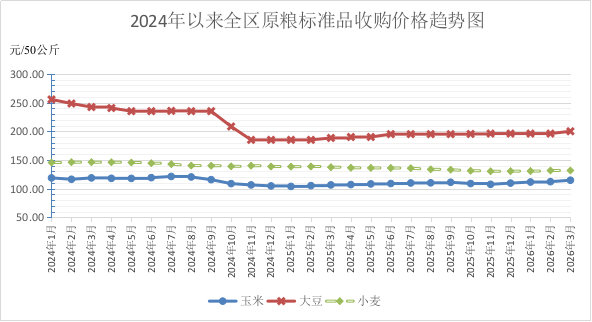 2026年3月份,全区玉米、大豆收购价格上涨,小麦收购价格保持稳定;与去年同期相比,小麦收购价格下降,玉米、大豆收购价格上涨。
