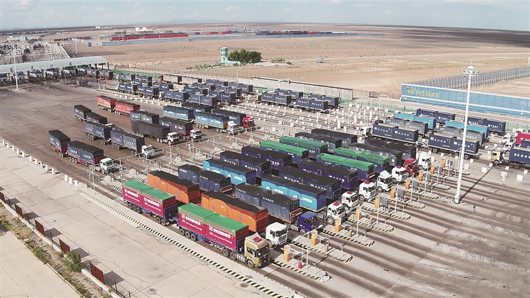 跨境运输车辆在策克口岸“十进六出”凭货运通道有序通关。
