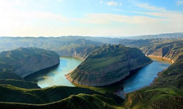 进入峡谷,站在“V”字观景台上,极目远眺,逶迤[wēi yí]的河流紧紧环抱着峡谷,几步一回头,在群山间折出一个完美的“S”形太极湾,远远望去,像一条碧色的玉带在清风中舞动漂浮,又像一条青翠圣洁的哈达,传唱着母亲河对准格尔儿女们的深深祝福。