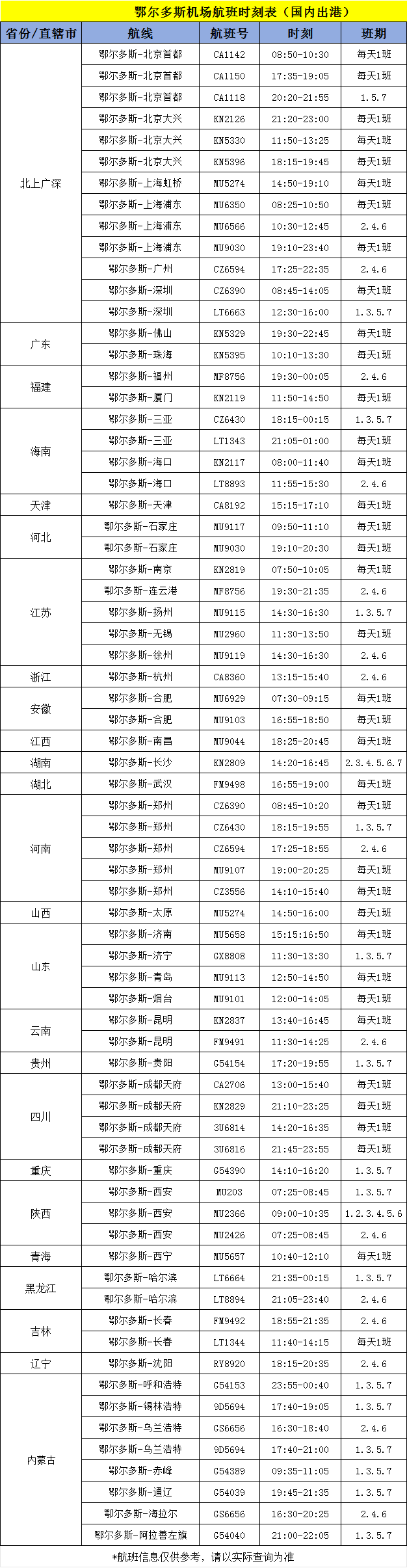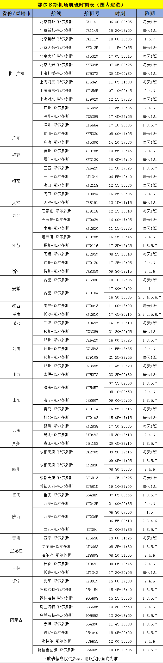 国内进出港航班时刻表