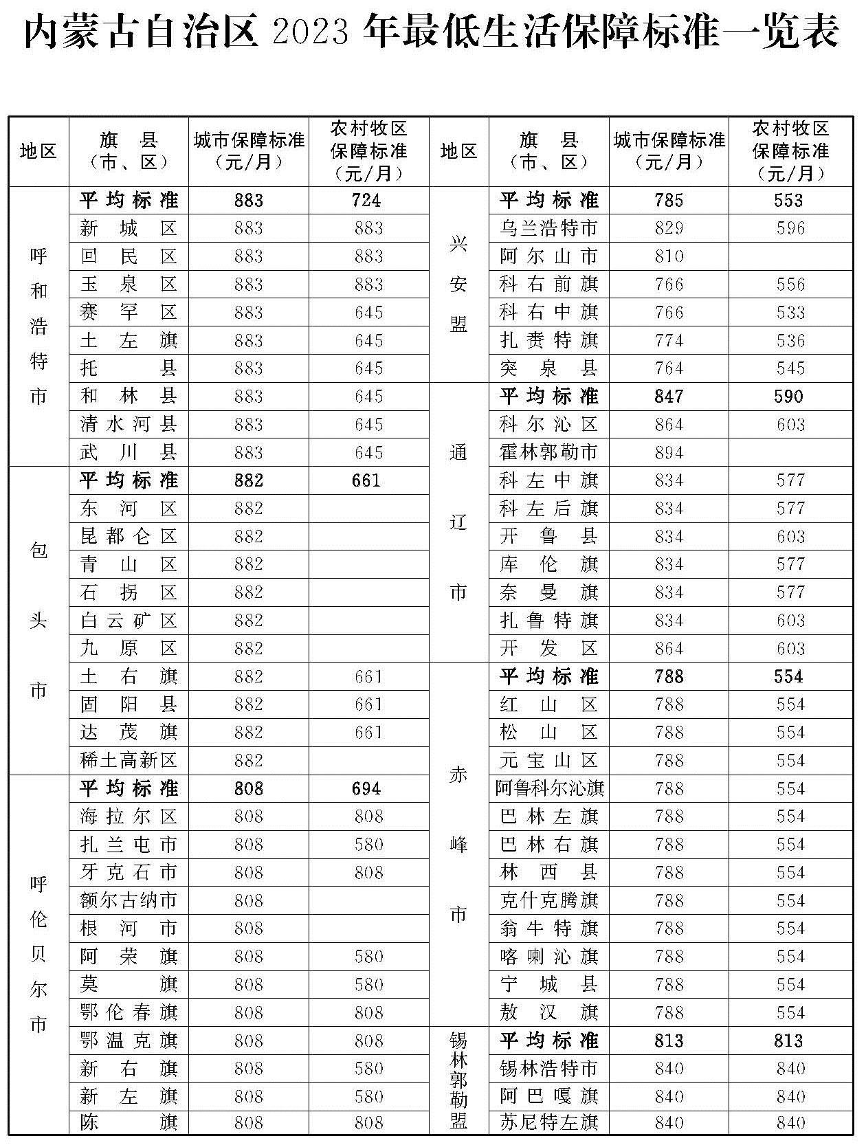 附件:1.内蒙古自治区2023年最低生活保障标准一览表