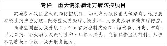 加强重大传染性疾病防治。完善重大疾病联防联控机制,全面落实医疗机构公共卫生职责,做好重大疾病的监测检测工作,提高重大疾病筛查和规范治疗率。加强传染病监测预警,法定传染病报告率保持在95%以上。继续实施扩大国家免疫规划,充分认识疫苗对预防疾病的重要作用,提高疫苗常规接种率和接种质量。完善新冠肺炎、鼠疫、艾滋病、结核病、肝炎、布病等重大传染病防治工作机制,创新预警监测和检测手段。完善重点地方病监测体系建设,落实防治措施,到2025年基本消除重大地方病危害。