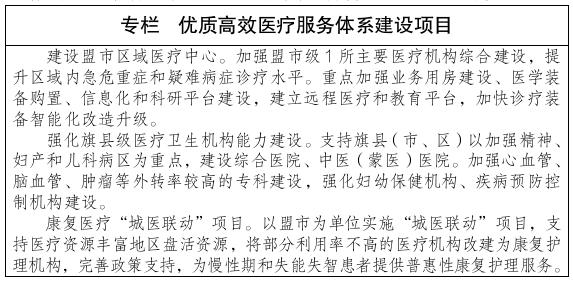 以提高重大疫情和突发公共卫生事件应对能力为重点,加快提高卫生健康供给质量和服务水平,构建更加注重早期预防和医防协同,更加注重优质扩容和深度下沉,更加注重质量提升和均衡布局,更加注重中(蒙)西医并重和优势互补的优质高效整合型医疗服务体系。根据常住人口、交通半径等因素,布局建设5个区域医疗中心。在呼和浩特市建设国家级区域医疗中心,在包头市、赤峰市、通辽市和鄂尔多斯市建设4个自治区级医疗中心。推动自治区域内优质医疗资源扩容下沉,聚焦重点病种和专科,按照“两级共建、网格布局、均衡配置”的工作思路,引导鼓励自治区级医疗资源富集的高水平医疗机构向资源薄弱地区疏解,通过建设分中心、分支机构、“一院多区”等方式,以肿瘤、神经、心血管、儿科、呼吸及创伤等专科为重点,开展盟市级医疗中心建设。