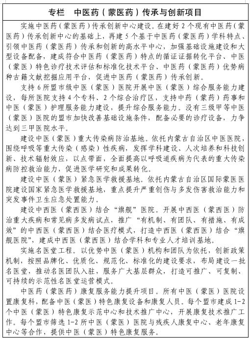 每个盟市所属盟市级中医(蒙医)医院至少1所达到三级甲等。旗县(市、区)中医(蒙医)医院基础设施建设任务全面完成,力争达到二级甲等水平。按照临床需求合理规划建设盟市级以上中医(蒙医)医院标准化制剂中心,依法依规调剂中药(蒙药)制剂。打造一批中医(蒙医)名院、名科、名医。加强中医(蒙医)临床科室和中药(蒙药)房建设,加强临床协作,整合资源、强强联合、优势互补、协同协作,提高重大疑难病、急危重症临床疗效。