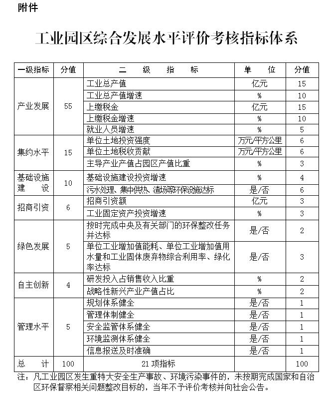 第二十条 坚持科学性、统一性、系统性、规范性、可操作性原则,科学设置评价考核指标。对园区产业发展、集约水平、基础设施建设、招商引资、绿色发展、自主创新、管理水平等方面进行综合评价。评价考核指标体系根据全区经济社会发展和园区管理实际进行调整。
