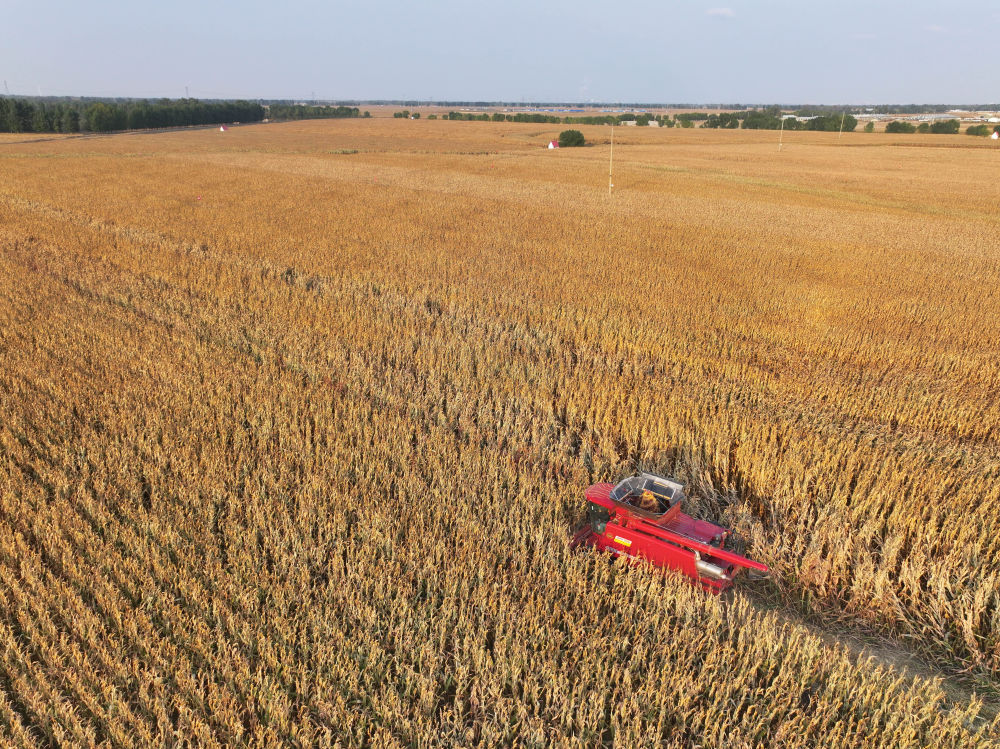 10月14日,在通辽市科尔沁区丰田镇哈拉满罕村,农机手驾驶收割机收割玉米(无人机照片)。新华社记者连振 摄