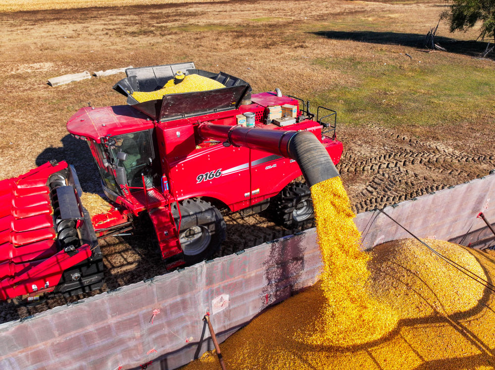 10月18日,在通辽市科尔沁左翼后旗吉尔嘎朗镇,农机手驾驶收割机将玉米装车(无人机照片)。新华社记者连振 摄