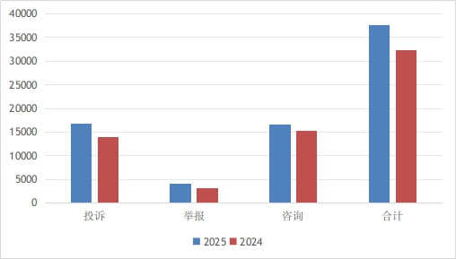 2025年11月份,内蒙古全国12315平台共接收消费者投诉、举报、咨询37596件,同比增长16.26%。其中,投诉16887件,占总量的44.92%;举报4120件,占总量的10.96%;咨询16589件,占总量的44.12%。