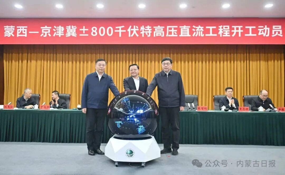 12月30日,蒙西至京津冀±800千伏特高压直流工程开工动员活动在内蒙古、河北两地以视频连线形式同步举行。自治区党委书记、人大常委会主任王伟中在内蒙古会场出席。12月30日,蒙西至京津冀±800 千伏特高压直流工程开工动员活动在内蒙古、河北两地以视频连线形式同步举行。自治区党委书记、人大常委会主任王伟中在内蒙古会场出席。草原云·内蒙古新闻网记者  马建兵 摄国家电网有限公司董事长、党组书记张智刚,自治区党委副书记、自治区人民政府主席包钢在内蒙古会场先后致辞。河北省委副书记、省长王正谱在河北会场致辞。自治区领导黄志强、于立新在内蒙古会场出席。国家电网有限公司总经理、党组副书记张文峰,河北省人民政府副省长赵大春在河北会场出席。12月30日,王伟中、张智刚、包钢在内蒙古会场,王正谱、张文峰、赵大春在河北会场共同启动工程开工装置。草原云·内蒙古新闻网记者 马建兵 摄王伟中、张智刚、包钢在内蒙古会场,王正谱、张文峰、赵大春在河北会场共同启动工程开工装置。据了解,蒙西至京津冀±800千伏特高压直流工程是内蒙古首条“沙戈荒”新能源大基地输出通道,工程起于内蒙古鄂尔多斯市达拉特换流站,途经内蒙古、山西,止于河北沧州换流站,输电距离700公里,计划2027年建成投运。工程建成后,每年可向华北负荷中心输送电量超360亿千瓦时,将有效扩大我区电力外送规模,有力促进华北地区能源结构绿色转型和节能减排,对于服务京津冀高质量发展、保障国家能源安全具有重要意义。